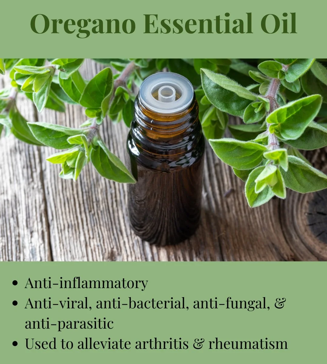 Oregano has been used to treat digestive issues, such as vomiting and diarrhea, as well as respiratory infections and issues, including asthma, bronchitis, and influenza. Diluted, oregano essential oil has been used externally to treat itchy skin, headaches, rheumatism, arthritis, insect stings and bites, and more.