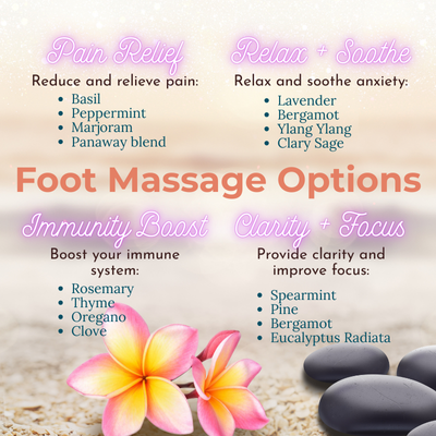Choose from four supportive options for your custom essential oil foot massage. Each option applies four different essential oils or oil blends to the soles of your feet: